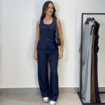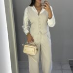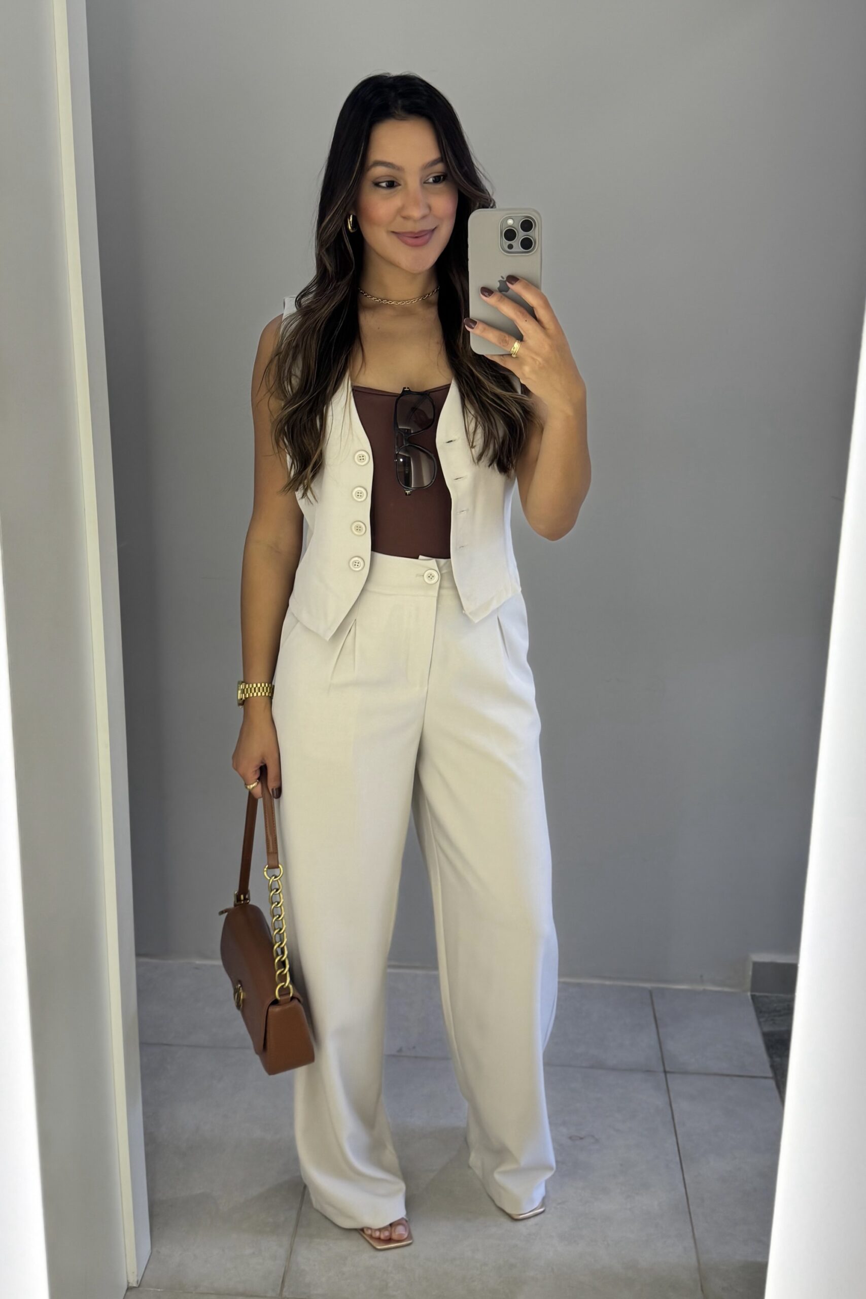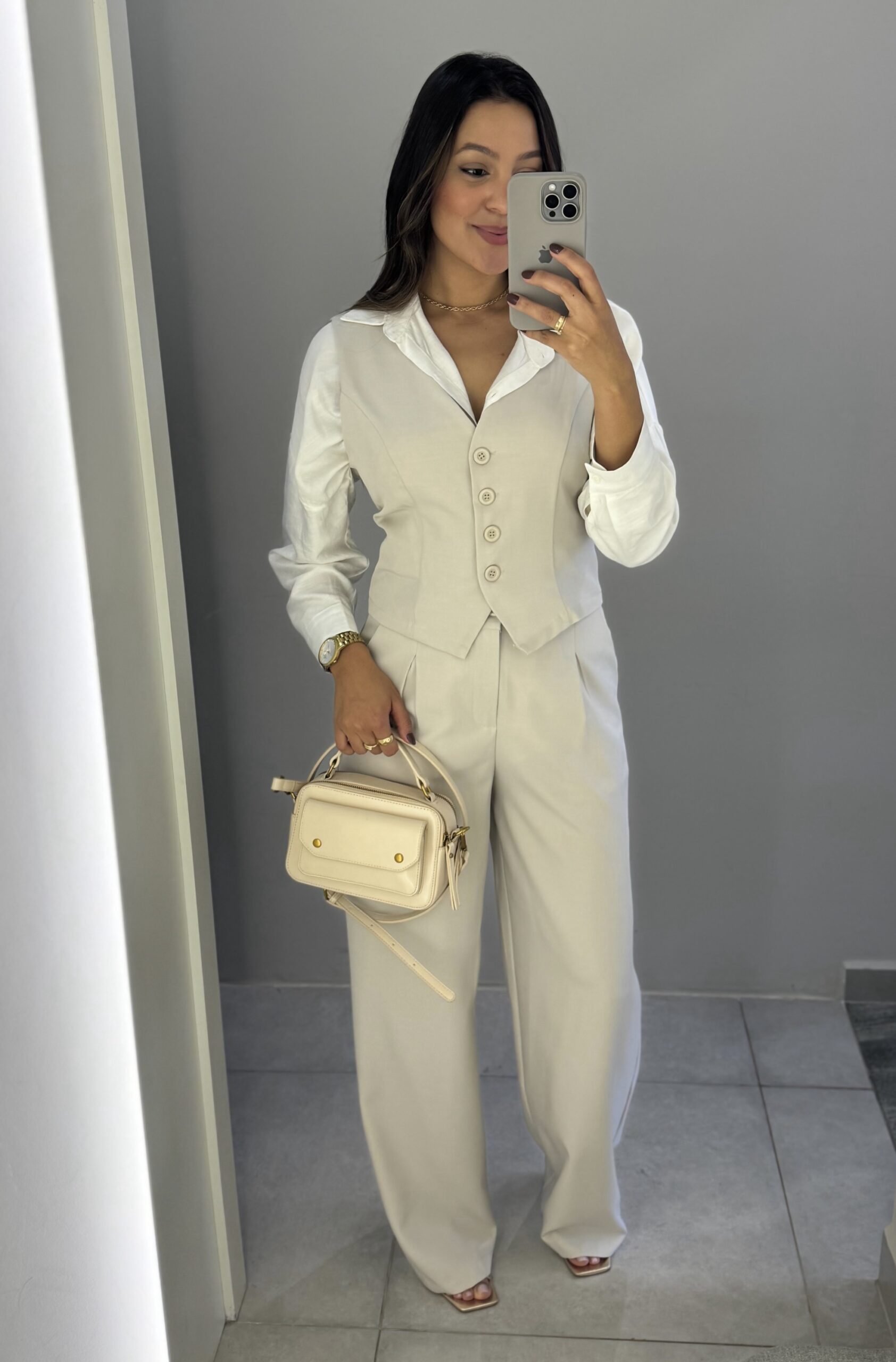 O Conjunto Elisa é ideal para quem gosta de um look moderno e minimalista. O design combina uma calça pantalona corte reto com fecho em botão e bolsos frontais funcionais e a blusa com decote sutil e silhueta ajustada e fechamento frontal por botões. Um Conjunto atemporal que pode ser facilmente combinado com diferentes acessórios e sapato, adaptando-se a diversas ocasiões.