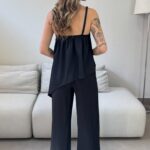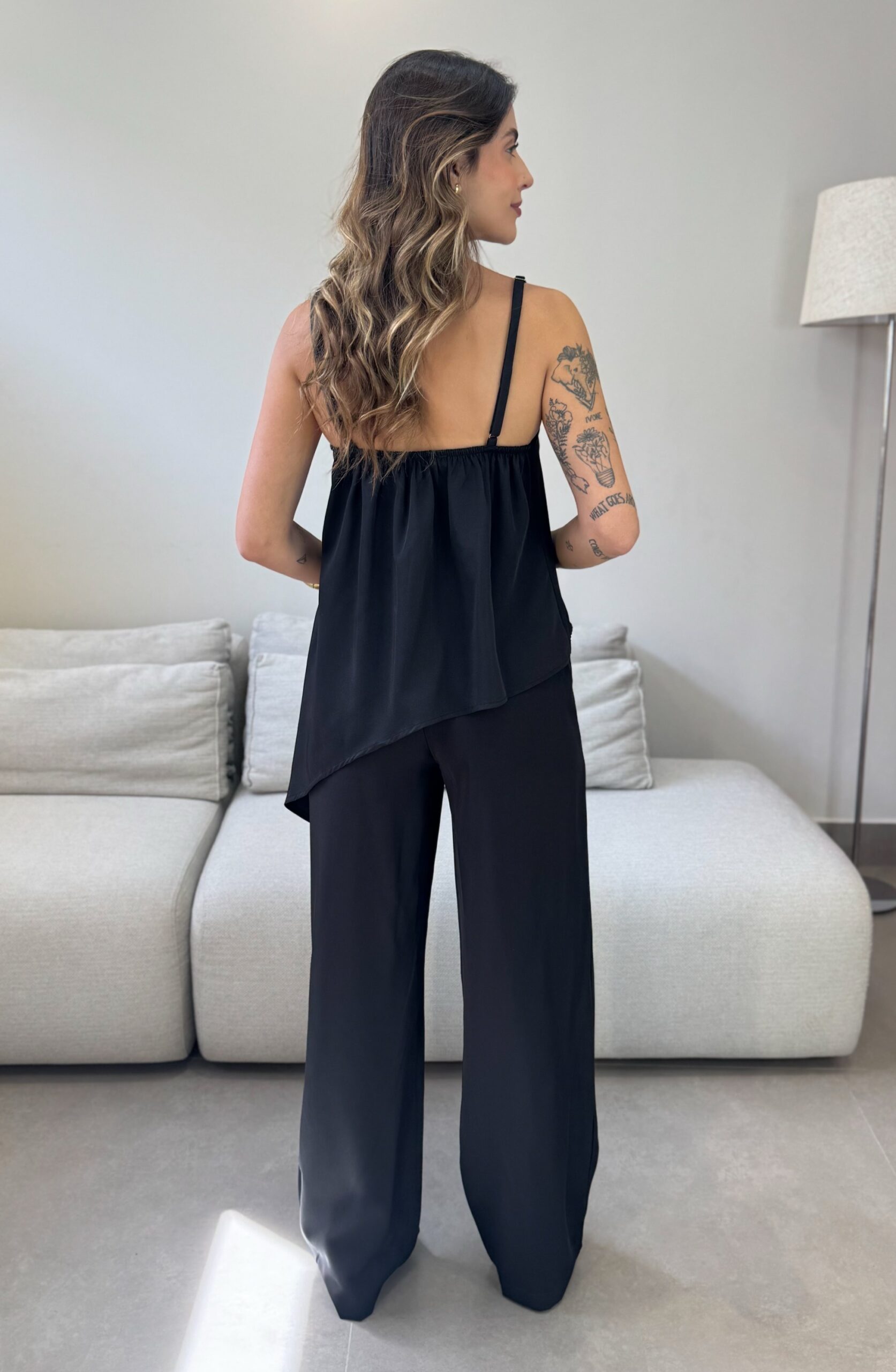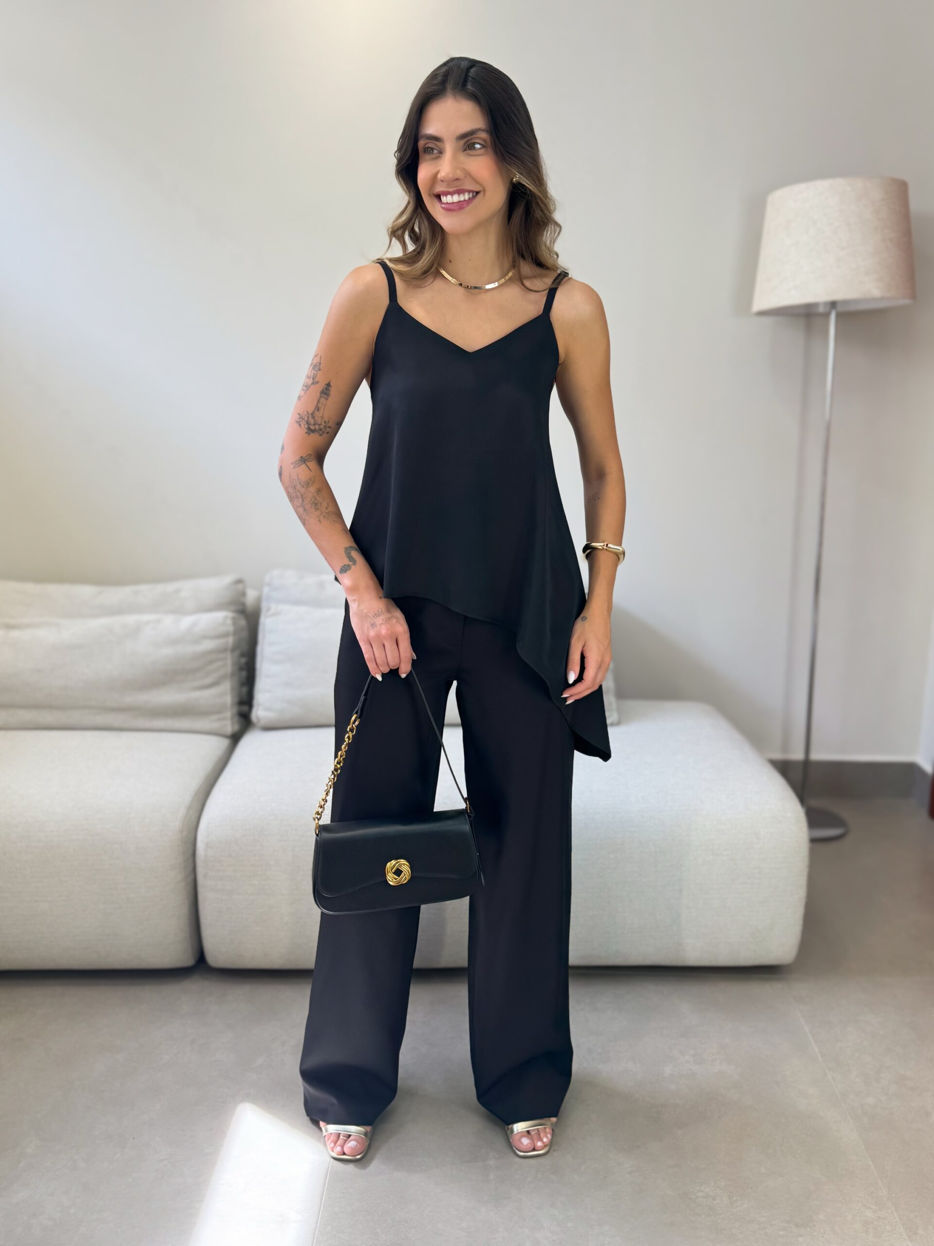 O Conjunto Eloá traz a elegância em um conjunto leve e sofisticado. A blusa possui alças ajustável e o recorte assimétrico com caimento fluido. A calça possui modelo pantalona, com bolsos frontais, unindo praticidade e delicadeza. Um conjunto versátil e elegante.