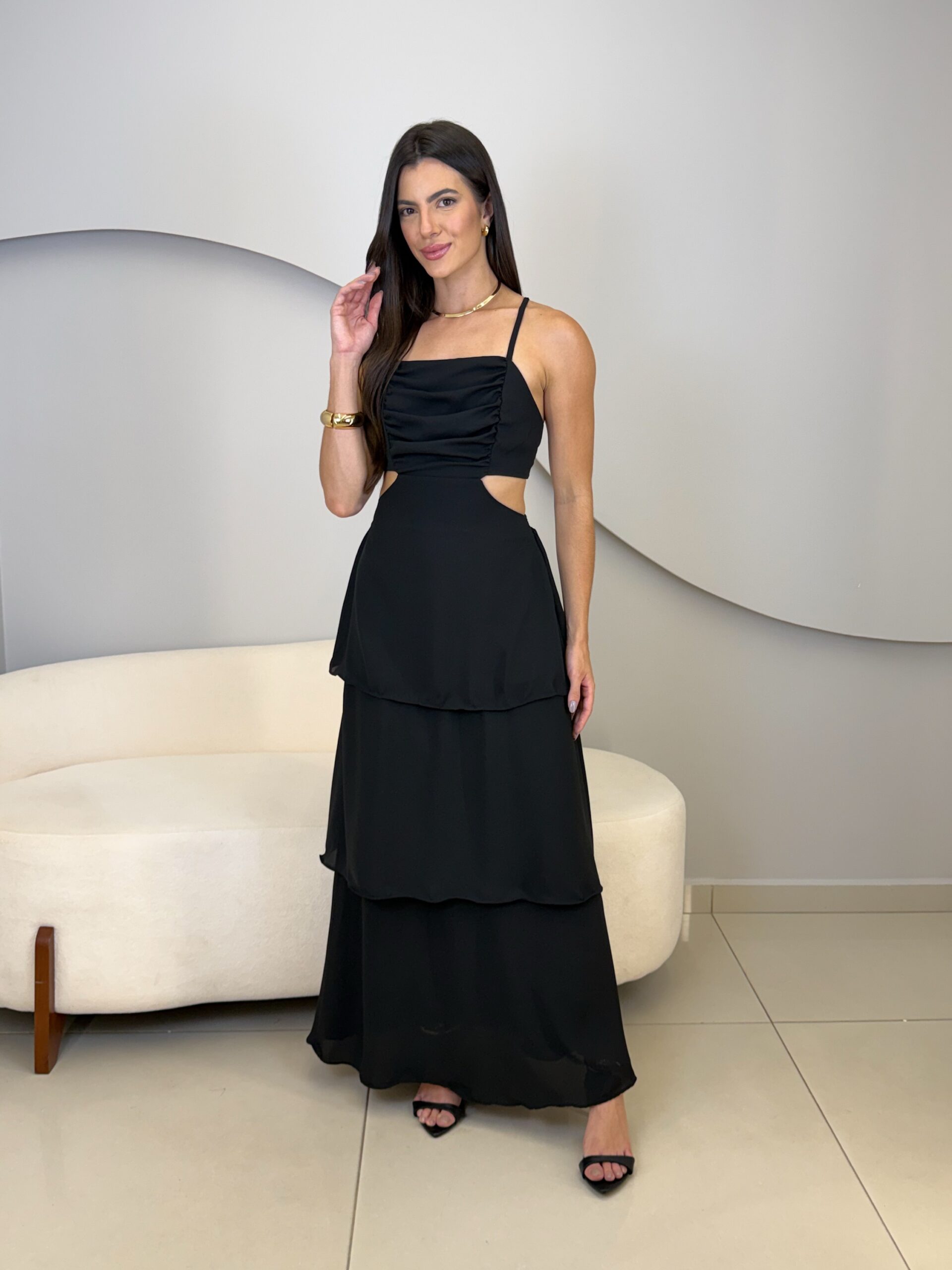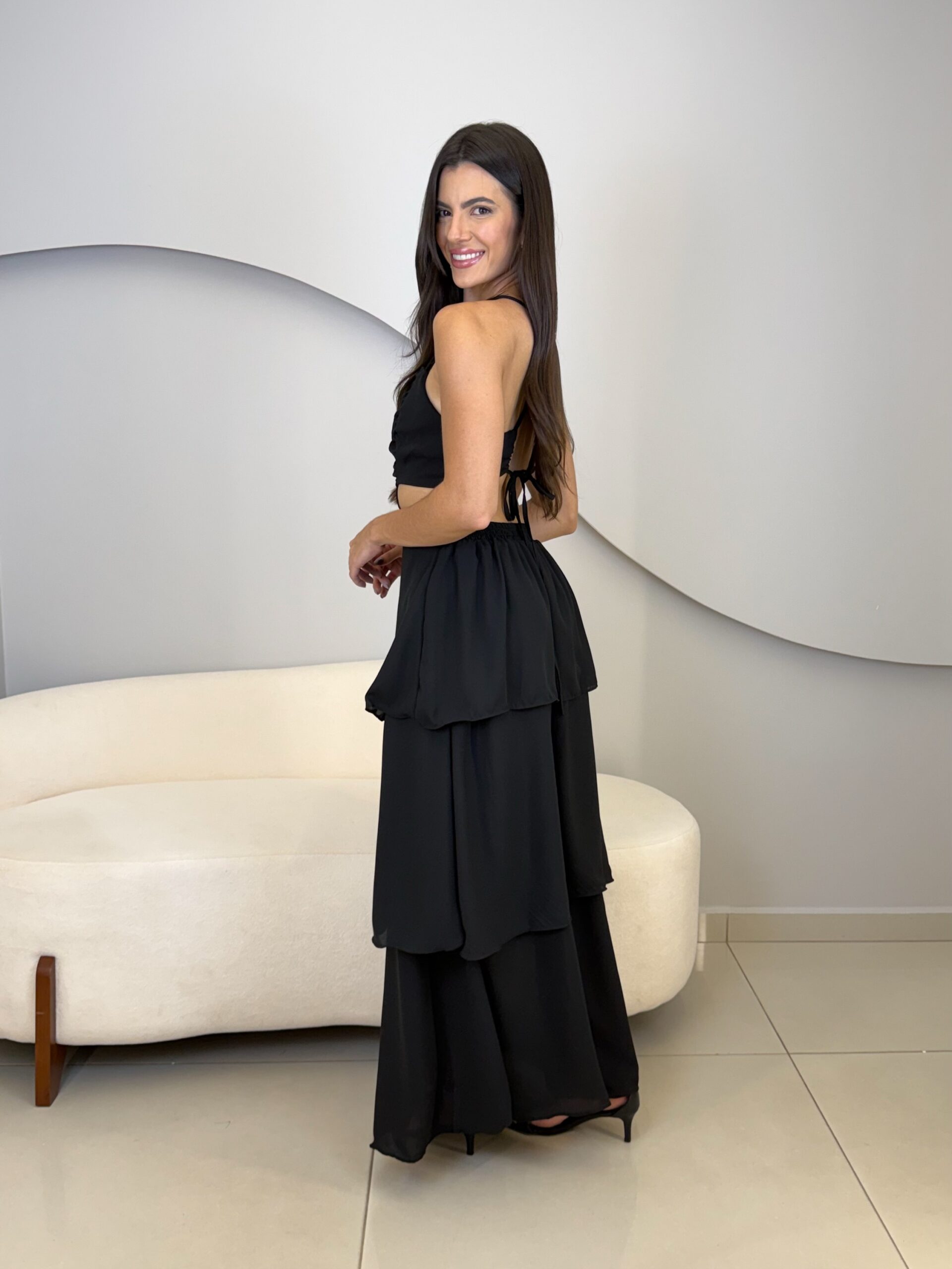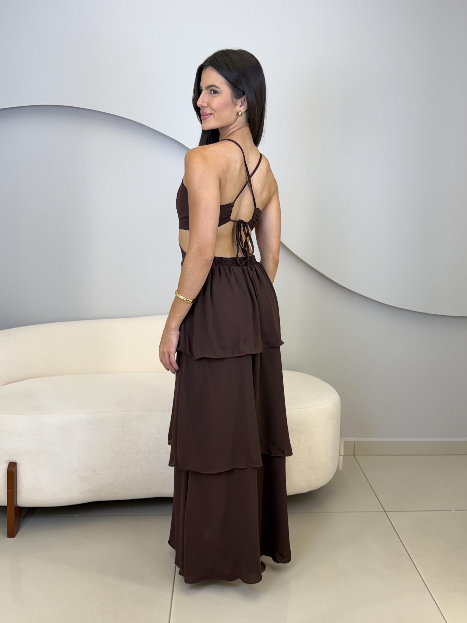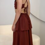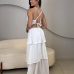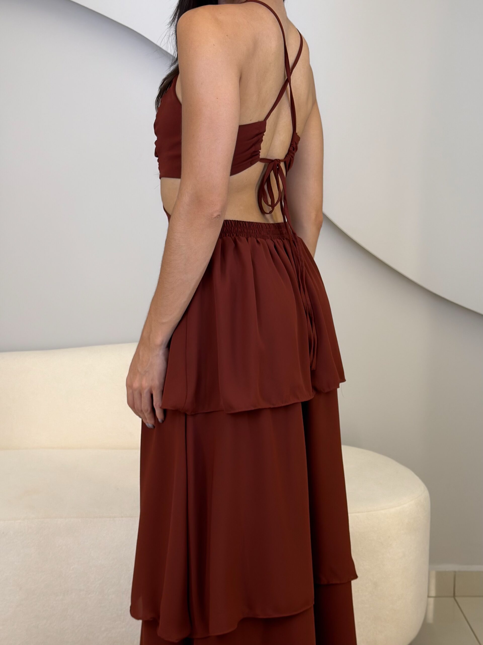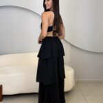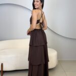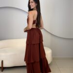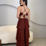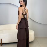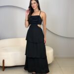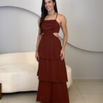 O Vestido Eduarda possui comprimento longo, com caimento leve e elegante. Com o tecido fluido e sobreposição em camadas de babados, ele traz um movimento suave ao vestido. O modelo possui alças finas que se cruzam nas costas, e elástico para mais conforto ao vestir. O acabamento refinado e a fluidez do tecido garante um vestido perfeito em cada detalhe. Ideal para eventos como casamentos, formaturas, festas ao ar livre ou ocasiões especiais que pedem elegância e presença marcante.