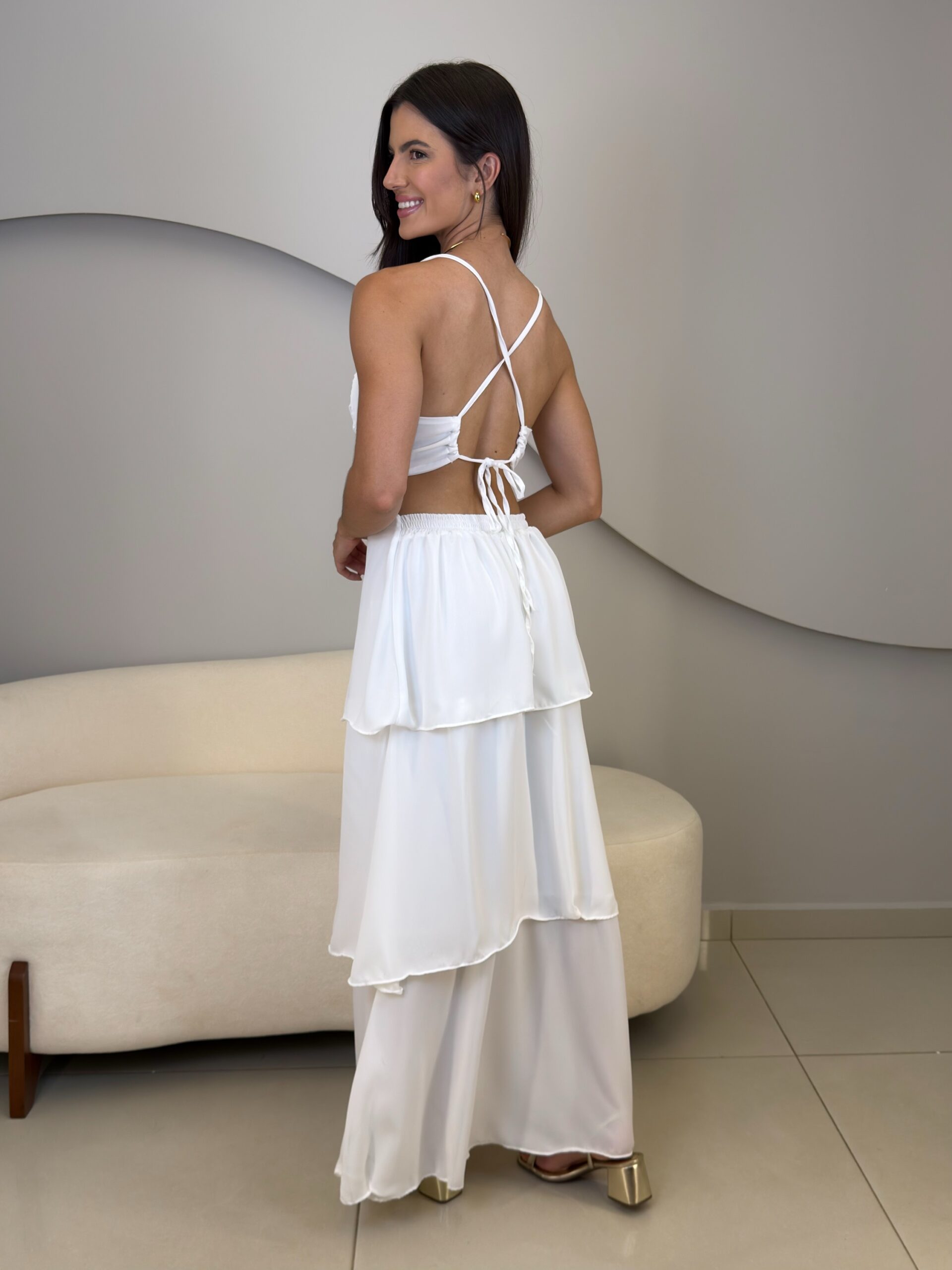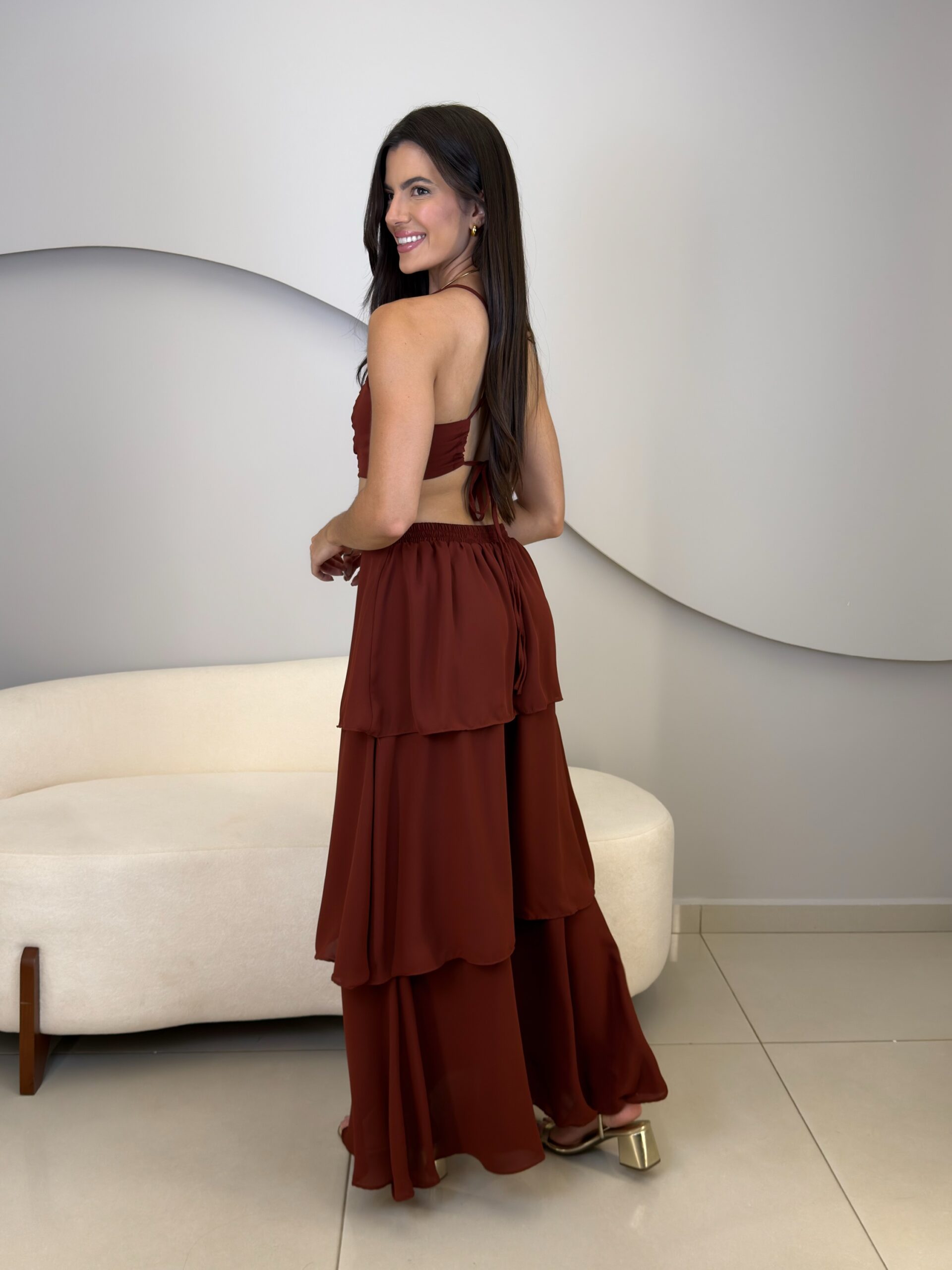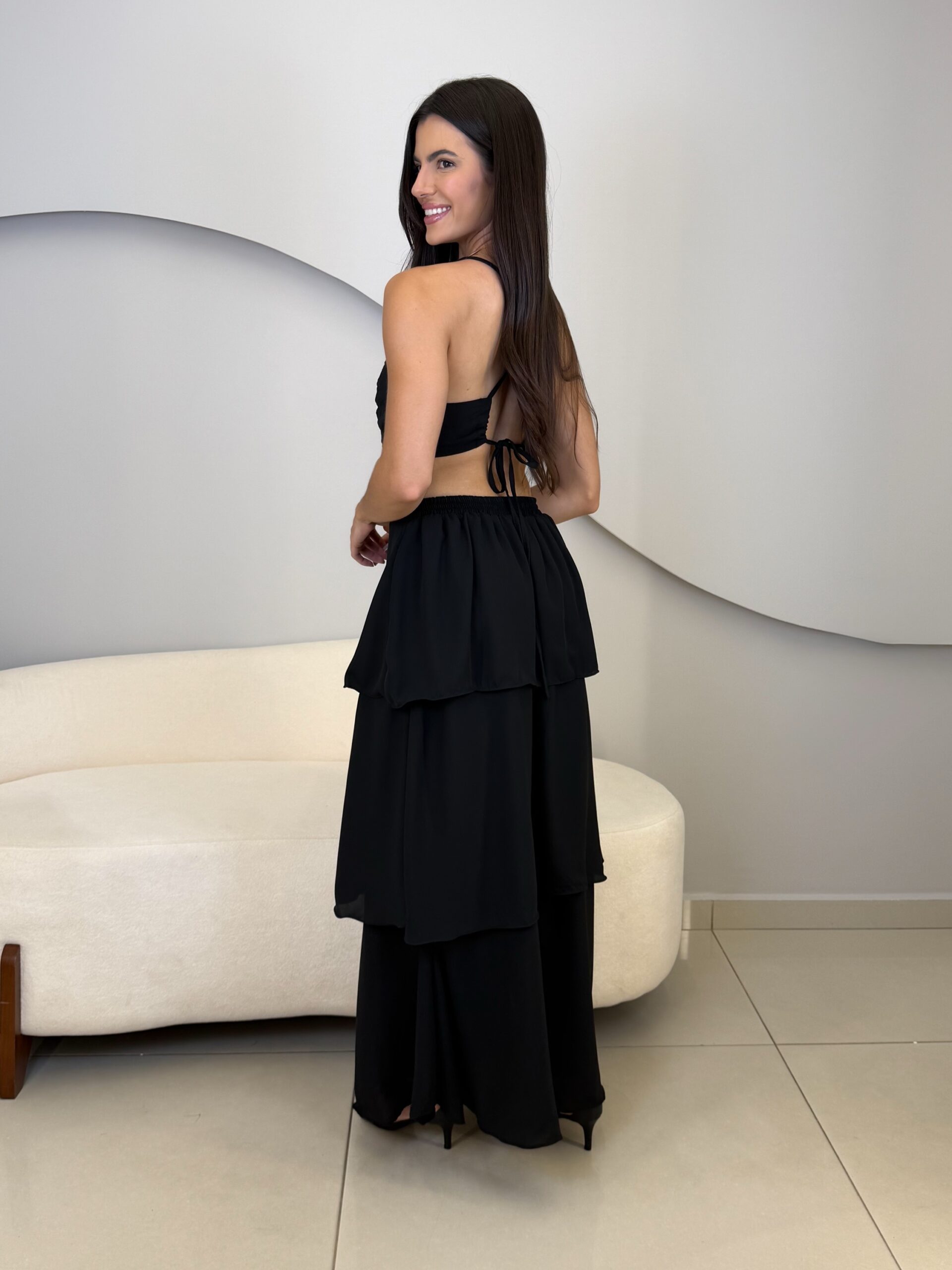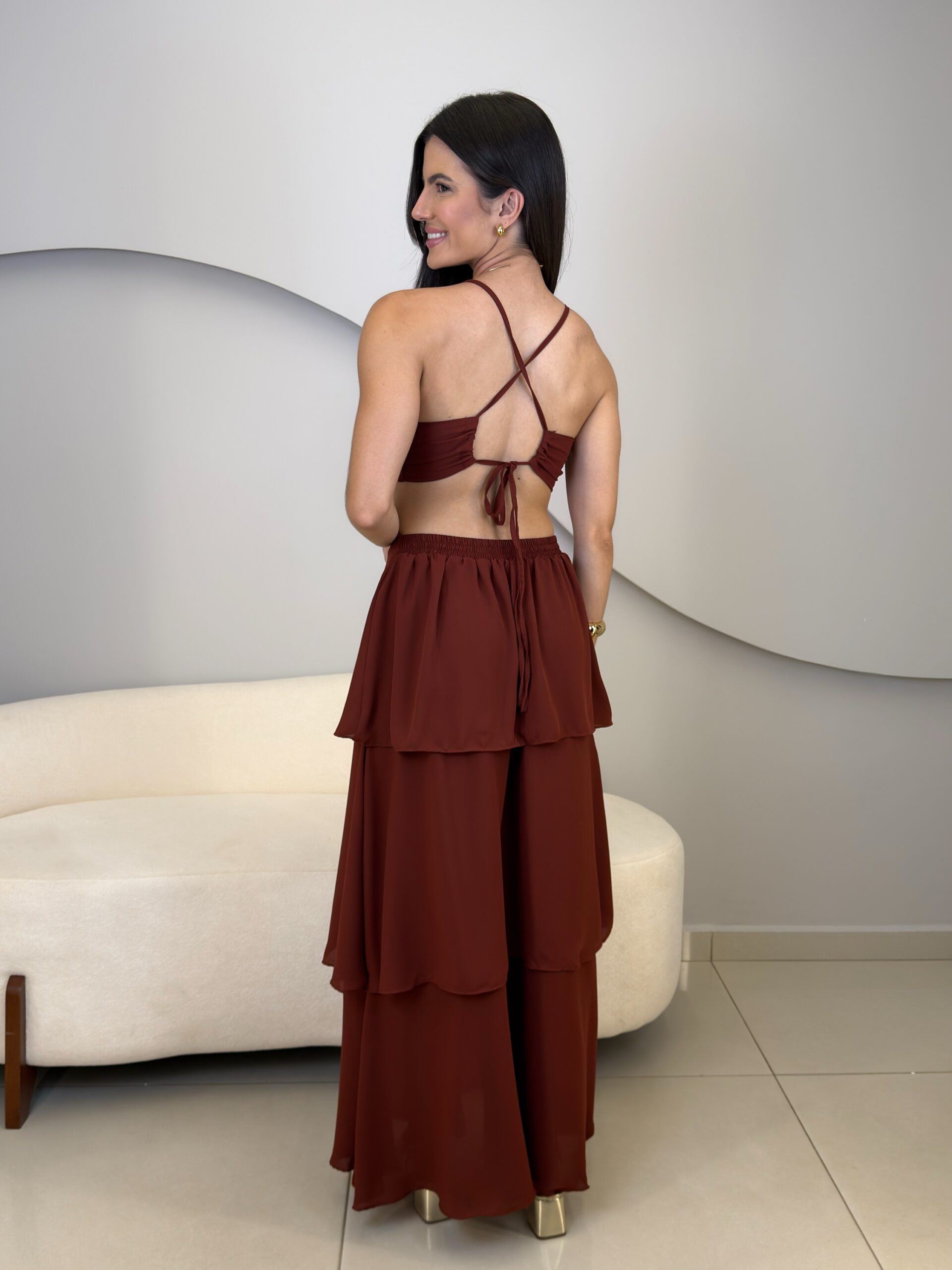 O Vestido Eduarda possui comprimento longo, com caimento leve e elegante. Com o tecido fluido e sobreposição em camadas de babados, ele traz um movimento suave ao vestido. O modelo possui alças finas que se cruzam nas costas, e elástico para mais conforto ao vestir. O acabamento refinado e a fluidez do tecido garante um vestido perfeito em cada detalhe. Ideal para eventos como casamentos, formaturas, festas ao ar livre ou ocasiões especiais que pedem elegância e presença marcante.